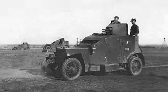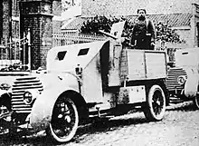 In the early months of the war, commercially acquired Peugeot type 153 tourers were hastily converted to open topped armoured cars by the addition of slab-sided 5.5 mm (0.22 in) thick armoured plates around the crew compartment and an unprotected rear fighting compartment with wooden sides with a central pivot mounted machine gun or 37mm Hotchkiss M1887 gun protected by a light gun shield, 120 were built.[1][3][4]