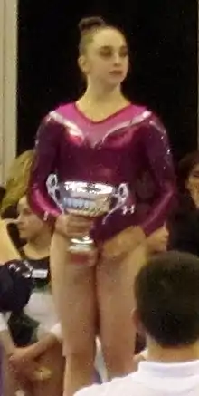 Ernst was born in Covington, Louisiana, in 1997 and began gymnastics in 1999. She currently lives in Coppell, Texas.[1] Ernst recently graduated from the University of Alabama.[2] She also has three sisters, Bailey (27), Madison (24) and Reilly (22).[3] All of them have been involved in gymnastics at some point since 2013. Ernst was the only elite gymnast of the family. Ernst signed the National Letter of Intent to the University of Florida in November 2014 and attended the school from the fall of 2015 to the spring of 2016.[4] Ernst was placed on medical leave from University of Florida.[5] Ernst transferred to the University of Alabama and began taking classes in the Spring of 2017.[6] On September 20, 2018 Ernst had announced her retirement from gymnastics on her Instagram page.