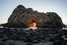 Pfeiffer Beach is located in the Big Sur region of California. It is one of the most popular beaches on the Central Coast[1] and is well known for Keyhole Rock, a popular photography subject. On a limited number of days in December and January each year, photographers crowd the beach to obtain pictures of the setting sun visible through the arch. Due to the steep terrain prevalent along the Big Sur coast, it is one of the few ocean access points within Big Sur[1][2]