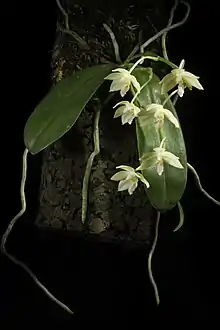 This species of herbaceous epiphyte has 5-7 leaves up to 25 cm in length and 9 cm in width. The leaves are longer than the 2-3 flowered inflorescences, which are 10–20 cm long and produce cream coloured flowers, which are 4 cm wide. Pale brown transverse colouration occurs at the bases of lateral sepals. The petals are plain cream white and unmarked. The midlobe of the labellum has a dull rose keel and a crenulate-denticulate apex with fleshy trichomes. The lateral lobes of the labellum are irregularly truncate. The slightly arching column is 6–8 mm long.[2]