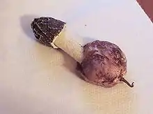 Phallus hadriani, commonly known as the dune stinkhorn or the sand stinkhorn,[3] is a species of fungus in the Phallaceae (stinkhorn) family. It is a widely distributed species, and is native to Asia, Europe, and North America. In Australia, it is probably an introduced species. The stalk of the fruit body reaches up to 20 cm (7.9 in) tall by 4 cm (1.6 in) thick, and is spongy, fragile, and hollow. At the top of the stem is a ridged and pitted, thimble-like cap over which is spread olive-colored spore slime (gleba). Shortly after emerging, the gleba liquefies and releases a fetid odor that attracts insects, which help disperse the spores. Said to be edible in its immature egg-like stage, it typically grows in public lawns, yards and gardens, usually in sandy soils. Phallus hadriani may be distinguished from the similar P. impudicus (the common stinkhorn) by the presence of a pink or violet-colored volva at the base of the stem, and by differences in odor.