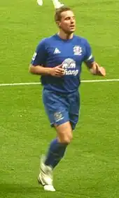 Jagielka eventually signed for Everton on 4 July 2007, in a deal worth £4 million on a five-year contract,[29] the highest amount paid for a Sheffield United player at the time.[30] He made his home debut at Goodison Park on 31 July 2007 as a second-half substitute in a pre-season friendly against Werder Bremen, replacing Joseph Yobo in central defence. After a slow start to his Everton career, Jagielka developed into an important member of the first team. He scored his first Everton goal in the UEFA Cup against AZ.[31] He scored an own goal against Wigan Athletic, although Everton won 2–1. He put in a succession of man of the match performances in the following matches, against Tottenham Hotspur, Brann and Manchester City. He scored his first league goal for Everton against Reading on 9 February 2008.[32]