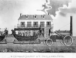 The Philadelphia, Germantown and Norristown Railroad was incorporated on April 5, 1831.[2] The company's initial line extended 6 miles (9.7 km) from Philadelphia to Germantown, and opened on June 6, 1832.[1] The company abandoned its original intention to extend to Norristown from Germantown and instead built west from 16th Street Junction in what is now North Philadelphia.[3] This line reached Manayunk on October 18, 1834, and Norristown on August 15, 1835.[1] The PG&N's Philadelphia depot was situated at Ninth Street and Green Street.[4]