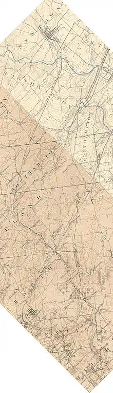When the PRR leased the railroad, 6.1 miles (9.8 km) of track had been laid, bringing the line to Fox Chase. By March 1877, the entire 22-mile (35 km) line to Newtown was open as a branch of the Connecting Railway, with equipment furnished by the PRR.[6] But the larger picture had changed by this date. One of the PRR's acquisitions in 1871 was an unbuilt railroad chartered a year earlier to run north from the Delaware River, and the PRR had it up and running by 1873 from Somerset Junction (on its Belvidere Delaware line) to Millstone, where it connected to a PRR branch from East Millstone to New Brunswick. Its location interfered with the Delaware and Bound Brook Railroad being built by Philadelphia and Reading Railway interests, because their railroad would now have to cross the PRR's line at some point. This led to the frog war incident at Hopewell, New Jersey, a battle of workmen, soldiers, and lawyers that was won by the Philadelphia and Reading Railway in January 1876. The PRR operated the Newtown and Somerset lines a little longer, but connecting them into a new Philadelphia and New York route would not happen. The Somerset was closed in 1879, and the Newtown line, no longer a danger, was sold to the Philadelphia and Reading Railway-controlled North Pennsylvania Railroad (NPR) the same year.[7]