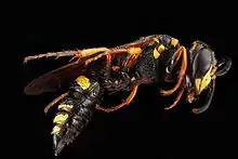 Philanthus gibbosus, which is commonly referred to as a beewolf due to its predation practices, is a species of bee-hunting wasp and is the most common and widespread member of the genus in North America. P. gibbosus is of the order Hymenoptera and the genus Philanthus. It is native to the Midwestern United States and the western Appalachians.[2] P. gibbosus are often observed to visit flowers and other plants in search of insect prey to feed their young. The prey that P. gibbosus catches is then coated in a layer of pollen and fed to the young wasps.