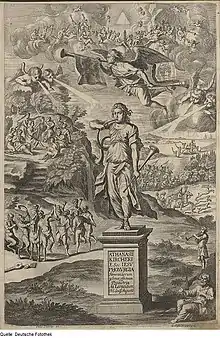 The frontispiece of the work depicts, at the top, a choir and orchestra of angels gathered around a pyramid representing the Holy Trinity. Beneath them an allegorical figure of Fame flies across the heavens blowing her trumpet and carrying a banner proclaiming "Canit inclyta caeseris arma" ("She proclaims the Emperor's illustrious arms"). On the left sits Apollo surrounded by the nine Muses on Mount Parnassus and below then Pan leads a group celebrating a bacchanalia. On the right a group of tritons escort Poseidon across the sea, kettledrums and trumpets accompany a cavalry charge, and a huntsman blows his horn while chasing deer. In the centre the figure standing appears to be Fame once again, standing on a pedestal blowing a horn. She also holds a trumpet, into which putti are blowing from above, while beneath them a man speaks into a tube while facing the surface of the pedestal. An echo, denoted by a dotted line, carries the sound from the pedestal to the ear of a man reclining at the bottom of the illustration.[2]: 41–42