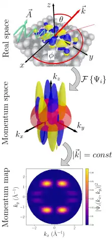 As illustrated in the figure, the relationship between the real space orbital and its photoemission distribution can be represented by an Ewald's sphere-like construction. Thus, a one-to-one relation between the photocurrent and the molecular orbital density in reciprocal space can be established. Moreover, a reconstruction of molecular orbital densities in real space via an inverse Fourier transform and applying an iterative phase retrieval algorithm has also been demonstrated.[4]