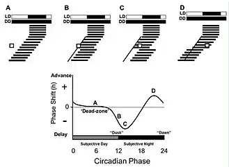Pittendrigh developed his model based on the phase-response curve, which visualizes the effect of short light pulses on organisms that were free-running (not entrained to a zeitgeber). Pittendrigh determined that an organism’s response to light depended on when the signal was presented. It was determined that exposure to light in the organism’s early subjective night (the early portion of an organism’s “normal” dark period) produced a delay in onset of activity in the following day (phase delay). Additionally, light exposure in the late subjective night resulted in advanced activity in the following day (phase advance).[8] The phase changes experienced by the organism could be represented by a phase-response curve consisting of portions including the advance zone, delay zone, and dead zone. This model became widely accepted over Aschoff's parametric model, but it is still unclear which model most effectively explains the process of photoentrainment.[7]