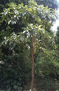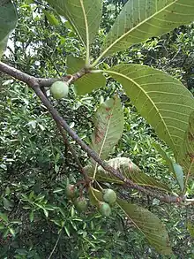 The Phulwara is a medium-size deciduous tree with a straight trunk. It typically attains a height of 15 to 22 meters and a girth of 1.5 to 1.8 meters. In the Andaman Islands it can reach a height of 21 to 36 meters and a girth of 1.5 to 2.4 meters. In the hills of Kumaun, the tree attains a girth of 3 meters. The bark is dark grey or brown.[1] The tree typically begins to yield fruits after five to nine years, reaching full potential in about fifteen years. It can yield fruits for fifty to sixty years.[2]