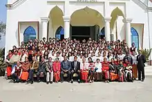 "Phungyo", a term derived from "Beautiful Hill" was given by Reverend William Pettigrew, when Hunphun (Ukhrul headquarter) elders told Pettigrew that a beautiful mount or hill is known as Phungyo in Tangkhul-Naga dialect.[2] The Church, Phungyo Baptist Church, is constructed on this hill; hence, the name. The first Christian Church in Manipur, the church trace its origin to 29 September 1901, when 12 Tangkhul men were converted to Christianity by Pettigrew. The birth of Christianity among the Tangkhuls is therefore associated with this conversion. Baptized at Ngayira Rakhong (Ngayira Spring Pond), the first converts include, Hollei Rumthao, Sangmayang Kashung, Ramkaiphang Samrar, Leishisan Shaiza, Maninglum Kashung, Mangaleng Shaiza, Sakhayang Awungashi Shimray, Shangam Kasar, Kaphungkui Chiphang, Haora Mahongnao, Mashokring Kasomhung, and Thiksha Shokchui Kapai.[2] Women later followed the step, and ten of them converted to Christianity in 1910. Baptized by Pettigrew, they include, Sanamla Ragui, Mahongai Rumthao, Horngaila/ Harngaila Singnaisui, Lanotla Samrar, Charoni Ngakang, Ngalew Ngakang, Kasuni Ngakang, Shareila Muirung, Lasengla Kasomwoshi, and Mikngaola Shingnaisui. The first Phungyo Church that the converts attended were made of mud walls, and having left in ruins by Allied air raid in search of Japanese forces during the second World War, the present (standing) church was reconstructed, and inaugurated by Kanrei Shaiza on 7 February 1977.[2]