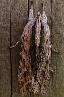 Male. — 45 mm. Head, palpi, thorax, and legs grey-whitish ; crown with two brown lines meeting in front ; palpi with second joint externally brown ; thorax with large anterior crest, two brown dorsal lines meeting in front, diverging and very indistinct posteriorly. Antennae grey, filiform, moderately ciliated. Abdomen grey, sides and anal tuft paler, and ochreous-tinged. Forewings moderately dilated, costa straight, apex obtuse, hind-margin crenulate, obliquely rounded ; pale ochreous-grey, densely and suffusedly irrorated with white, tending to form longitudinal streaks ; inner margin suffused with brownish ; lines hardly traceable, strongly dentate ; reniform narrow, white, anteriorly suffused, posteriorly edged with an interrupted blackish line ; subterminal indicated by a posterior brownish dentate margin, diverted to hindmargin below apex : cilia ochreous-grey, mixed with white. Hindwings rather dark grey ; cilia whitish, with a grey line.[1]
