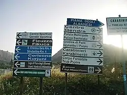- ↑ There are political-cultural relations with the Albanian capital, which have not been continuous. It is important to remember the flag donated by the government of Albania in 1954 to the people of Piana degli Albanesi, and kept at the Casa del Popolo, or the gift of the bust of Giorgio Castriota Scanderbeg in 1968. Then the closure of the Albanian communist state closed the contacts official until around 1988. We must mention the historical religious relations with Himara, the cultural ones with the city of Argirocastro and the twinning with the other Albanian municipalities of Italy.