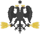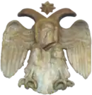 [...] Ricamato con fili di seta di colore giallo in varie tonalità, raffigura un'aquila bicipite ad ali spiegate con le teste coronate e sormontate da una stella a sei punte e con tre spighe di grano in entrambi gli artigli. (Embroidered with yellow silk threads in various shades, it depicts a two-headed eagle with spread wings with crowned heads and surmounted by a six-pointed star and with three ears of wheat in both claws.)