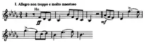 The first movement starts with a short horn theme in B♭ minor, accompanied by orchestral chords that quickly modulate to the lyrical and passionate theme in D♭ major. This subsidiary theme is heard three times, the last of which is preceded by a piano cadenza,[27] and never appears again throughout the movement. The introduction ends in a subdued manner. The exposition proper then begins in the concerto's tonic minor key, with a Ukrainian folk theme based on a melody that Tchaikovsky heard performed by blind lirnyks at a market in Kamianka (near Kyiv). A short transitional passage is a call and response section on the tutti and the piano, alternating between high and low registers. The second subject group consists of two alternating themes, the first of which features some of the melodic contours from the introduction. This is answered by a smoother and more consoling second theme, played by the strings and set in the subtonic key (A♭ major) over a pedal point, before a more turbulent reappearance of the woodwind theme, this time reinforced by driving piano arpeggios, gradually builds to a stormy climax in C minor that ends in a perfect cadence on the piano. After a short pause, a closing section, based on a variation of the consoling theme, closes the exposition in A♭ major.[28]