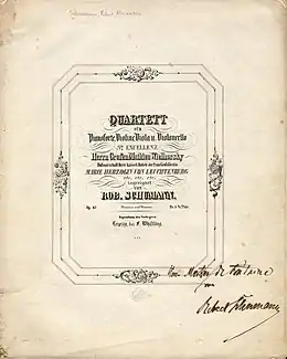 Like the Piano Quintet, the Piano Quartet was written with his wife Clara in mind, though it was dedicated to Count Mathieu Wielhorsky, a Russian cellist and impresario.[7] A private performance of the work took place on 5 April 1843 at the Schumanns' home in Leipzig, with Clara at the piano, who described the quartet in her diary as a "beautiful work, so youthful and fresh, as if it were his first".[7] After making several revisions, on 24 August 1843 Schumann offered the work to the publisher Friedrich Whistling and received a fee of 100 thaler. After several delays due to the Schumanns' tour of Russia in 1844, where the work was performed at a private recital, it was published in May 1845.[8] The manuscript is today held at the Berlin State Library, while the initial sketches have been lost.[9]