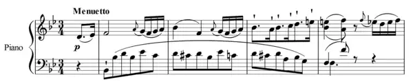 The third movement is in minuet and trio form, but the trio is instead a very contrasting "Minore". The first 30 measures of the Menuetto are in B major, the Minore is in G minor (the relative minor of B flat major). The end of the Minore is marked Menuetto D.C. senza replica which means to play the Menuetto again, this time without taking the repeats. This is the shortest movement.[2]