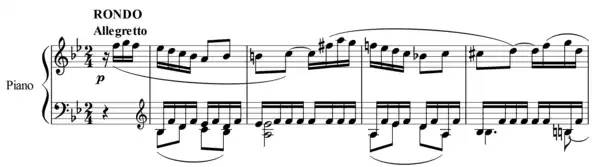 The fourth movement is in a rondo form: A–B–A–C–A–B–A–Coda.[2] The first "A" theme starts in the tonic key, and the "B" theme transitions into the dominant key with big grand arpeggios in the right hand using a good portion of the keyboard. After the arpeggios, both hands play around with the "A" theme's melody before arriving back to the tonic key at the second "A" theme (with very little deviation from the first "A" theme). Suddenly, the "C" theme begins with a key change into B minor (although not marked in the key signature). The sharp forte chords, although in stark contrast with the rest of the rondo, bear some resemblance to the first few chords of the "B" theme. The right hand then plays urgent thirty-second notes while the left hand supports with staccato sixteenth notes. This reaches a climax, a call-and-response play on the beginning of the "C" theme, and the thirty-second-note passage with the climax again.
