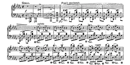 2 time. It opens with a four-bar introduction in the relative major, D♭ major[8] marked Grave, followed by a tempo change to Doppio movimento,[note 4] a key change to the tonic key, and the introduction of an agitated[7] bass accompanimental figure; four bars later, the main theme enters. The main theme, marked agitato, is followed by a second theme, in D♭ major, which is marked piano and sostenuto. In the beginning of the development, all of the themes introduced in the exposition appear.[note 5] Later in the development, a seemingly new tune, which is actually an inversion of part of the second theme, is introduced. In the climax of the development, Chopin combines three elements at once: the motifs from the Grave introduction and the main theme in the bass and treble respectively, with crotchet triplets in the middle.[9] In the recapitulation, the principal section containing the main theme does not return, possibly inspired by the older binary sonata form typical of Domenico Scarlatti's keyboard sonatas;[10] instead, only the lyrical second theme returns in the tonic's parallel major of B♭. The movement is closed with a brilliant[7] 12-bar stretto which forms a coda of 12 bars, ending in three B♭ major chords marked fff (fortississimo).