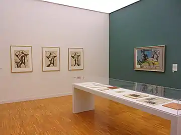 The 137 works[7] (paintings, sculptures, drawings, engravings) are presented in chronological order from year to year throughout the 16 rooms. During the war, Picasso chose to stay in France and devoted himself to three classic themes: still lifes, the female nude, and the portrait. One of the first works is Chat saissant un oiseau (Cat seizing a bird) from April 22, 1939, illustrating the fear of the painter faced with the threat of a war in Europe with the capture of Prague by the Nazis.[8]