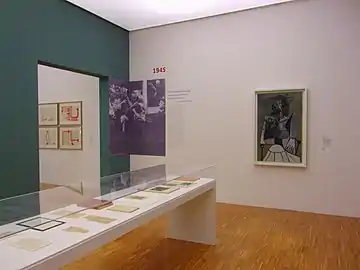 Each year begins with a giant historical photograph linked to current events. For the year 1940, Picasso traveled between Royans and Paris where he painted disturbing paintings of toothed fish, such as Café à Royans in August 1940. Without painting the war, he would represent violence in his paintings. In 1941, while Picasso and his companion Dora remained in a Paris subject to restrictions, he painted Jeune garçon à la langouste (Young boy with lobster), thus defying the Nazi occupier. That same year, he painted his companion in the paintings Buste de femme (Bust of a woman) and Femme assise dans un fauteil (Woman seated in an armchair). In 1942, still in his workshop in the Grands-Augustins, he produced a sculpture of a painted bronze head but also his paintings L'Aubade and Nature morte au crane de taureau (Still Life with the Skull of a Bull), a tribute to his friend Julio González who had recently died. This last painting serves as a poster for the exhibition.[9]