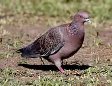 It is a large pigeon with a wingspan of up to 22 inches and can weigh as much as a pound.[2] It is a brown bird with white dashes on the back of its neck and darker brown wing patterns. It is similar in appearance to the spotted dove.