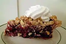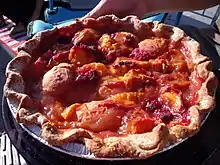 Peach pie is made with fresh, frozen or canned peaches. The basic fruit pie filling, made with fresh fruit, lemon juice, sugar and cornstarch, can be frozen in advance and used later. The basic fresh peach pie can be combined with other fruits like strawberry, blueberry, blackberry, apple, pear or prunes.[44] Peach pie can be topped with whipped cream or streusel with other ingredients like nuts, fresh fruit, coconut or cinnamon.[29]