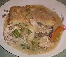 Catholic French-Canadians who settled in New England ate salmon pie on Fridays when observant Catholics abstain from eating meat.[53] It was also eaten during Lent. There are several variations of the simple pie, made with canned salmon. The salmon could be combined with mayonnaise and lemon juice and baked in pastry and served with mushroom gravy.[54] Vegetables could be added such as celery, carrots, potatoes and peas.[55] Some versions include onions, green pepper, or milk and creamed corn thickened with egg.[56]
