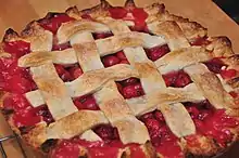 A basic cherry pie can be made by simmering cherry juice with sugar, cornstarch and a pinch of salt in a saucepan until thickened. Once thickened, butter is stirred in, then the mixture is poured over the pitted cherries into a pastry-lined pie dish and baked in a hot oven. Lattice top crust is a common choice for cherry pies.[37]