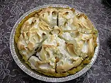 Butterscotch pie is made by cooking brown sugar with egg yolks, cornstarch, milk or cream and butter to make a butterscotch custard pie filling which is topped with meringue and browned in the oven.[7] Its invention is said to date back to 1904, credited to a creamery in Connersville, Indiana, where the recipe was published in the 1904 edition of a Methodist church cookbook.[8]