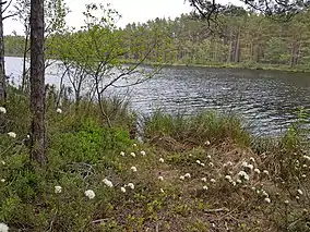 There are a few small bogs and one larger bog in the park - a 55.6 hectares (137 acres) large Serģu purvs.[4]:114 All bogs are dominated by natural processes with little human influence.[4]:121 Serģu bog formed when the 26.3 hectares (65 acres) Serģa lake was drained via ditches dug in 1906,[4]:114 and these ditches remain today.[4]:115 By 1940s, the lake had overgrown and there is only 0.4 hectares (0.99 acres) area of shallow (<1 metre (3 ft 3 in)) open water at present.[4]:114 Serģu bog is mostly wet and swampy, with some edges overgrown with trees and bushes.[4]:114,116,117 Most of the bog is covered with reeds and various transitional bog plants.[4]:117 Most of Serģu bog territory is of a Latvia's protected transition mire and quaking bog (7140) biotope, while the rest is active raised bog (7110).[4]:116 The bog's conditions are ill-suited for the growth of any protected species, although protected Hammarbya paludosa has been found.[4]:118 Around 8–9 hectares (20–22 acres) of still-living tree area is expected to become bogland within some decades, meanwhile serving as a habitat for various species dependant on dead trees.[4]:120 Other small bogs formed in depression between dunes and around areas of Garezers lakes where they have overgrown with plants forming transitional and raised bogs, or simply overgrown wet areas.[4]:118 Overall, the bogs are not suited for recreation and are of limited economic value, although their presence adds to the overall variety of the park.[4]:120 The bogs do however provide important water cycle and oxygen regulation, habitat for a variety of bog-exclusive species, and a natural barrier to invasive species and forest fires.[4]:120–121