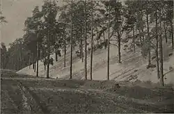 Between 19th and 20th century, the area between Lielupe estuary and Pabaži used to have a 2,200 hectares (5,400 acres) area with sand and dune fields, either naked or with shallow scrub overgrowth.[7] Due to long-term effects of wind, this sand become shifting dune ridges that slowly "travelled" over 200 years, burying old forests, waterways and damaging infrastructure.[7][8][9] In 1870s, about 200 hectares (490 acres) area was buried around Riga between Daugava and Lielupe estuaries. The lack of drainage caused the meadows to become swampy and required expensive canal construction for water drainage.[7] In 1930s, Piejura area had about 1,000 hectares (2,500 acres) of unsecured flowing sand with some ridges like Bākas hill moving and burying forest 1.85 metres (6 ft 1 in) per year. To stop the shifting sands, forestation works were carried out first covering the sand with branches and planting scrub and bushes to stop the sand movement and later planting trees to secure the area long-term.[8] Towards the end of 20th century, the sand movement had stopped.[9]