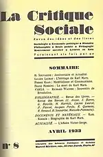 Front cover of the Critique Sociale's 8th edition featuring articles by Pierre Kaan, George Bataille and Boris Souvarine.