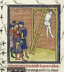 Pierre de La Brosse hanged, in a ms of Chroniques de France (B.L. Royal 20 C VII f. 15