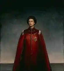 The 1969 portrait was commissioned by the trustees of the National Portrait Gallery and funded by art dealer Hugh Leggatt.[7] The style of the second painting stood in contrast to the first. It has been described as "stark and monumental" with Elizabeth "standing against an ambiguous, spare and gloomy, plain background", as opposed to the earlier "glamorous and romantic" portrait. Annigoni said of the second portrait of the Queen that he "did not want to paint her as a film star; I saw her as a monarch, alone in the problems of her responsibility".[1][7]