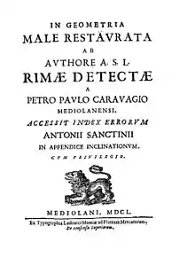 - Caravaggio, Pietro Paolo (1650). In geometria male restaurata (in Latin). Mediolani: Lodovico Monza.