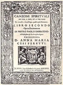 - ↑ Comune di Ronciglione: Fabio Carboni, Valeria De Lucca, Agostino Ziino - 2003 "Sabbatini lavorò presso questa Arciconfraternita certamente fino al 1628, come risulta dal frontespizio del Sesto Libro di ... di Pietro Paolo Sabbatini Maestro di Cappella dell' Arciconfraternita della Morte, & Orazione di Roma."