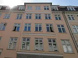 The four individual buildings at Pilestræde 3945 are all five storeys tall, making them one storey taller than the norm for apartment buildings at their time of construction. Their plastered and grey-painted facades leave a homogeneous impression, together with those of the adjacent buildings at Pilestræde 3739, although details of their facades vary. The three central bays of Pilestræde 39 form a slightly projecting median risalit crowned by a three-bay wall dormer in the mansard roof. The median risalit is accented with a dentillated belt cornice above the ground floor, shadow joints on the first floor, a blank frieze above the second floor and a dentillated cornice below the roof. The dentiallated cornice continues across the three-bay wall dormer as a blank frieze. The main entrance is located in the bay furthest to the left. It opens to an anteroom which continues through the building. A three-bay-long side wing extends from the rear side of the building along one side of a central courtyard bounded by Pilestræde 37 and Kronprinsensgade 11 on its other sides. The side wing has a monopitched roof, complemented by the monopitched roof of the adjoining side wing of Pilestræde 41. The rear side of the front wing and the facade of the side wing are painted yellow, with green-painted windows.[13]