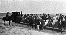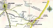 In 1913 a group of Belgian entrepreneurs inaugurated Ostende, a village in the coast built on a land they had bought to the Guerrero family. To go to Ostende, passengers went by train to Juancho, then being transported by horse-drawn carriages to "Colonia Tokio" where they took a narrow-gauge railway (Decauville) to Ostende.[5] On economic grounds, the coming of the train helped the zone to increase its production. Apart from cattle, producers commercialised apples and firewood, for which some small branches were built. One of those branches reached the point where the intersection of RP 11 and RP 74 is placed today, very close to the entrance to Pinamar. Nevertheless, most of those branches would be lifted in the 1940s.[1]