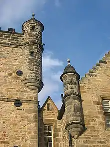 Seton's main addition was the long three-storey south wing, which includes on its upper floor the 96-foot Painted Gallery. His mason may have been William Wallace, although this attribution is only stylistic.[6] On the south facade is a bay window, a feature new to Scotland in the early 17th century. The east façade is dominated by seven tall chimneys. There is a fine wooden ceiling, with classically inspired paintings in tempera, in the long gallery, as well as many 17th-century plaster ceilings. Another small painted ceiling was removed in 1951 and installed at the Huntly House museum in Edinburgh. Later interiors are by William Burn.