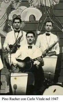 In 1946, Rucher entered the Carlo Vitale orchestra after coming first in a competition for the position of guitarist at Radio Bari.[1][3][5][6][7][8][9][10] After the dissolution of the Vitale orchestra, Rucher went to work for Radio Milano as a member of the Carlo Zeme orchestra.[5] In the 1950s and the early 1960s he also worked with two forerunners of Italian "swing", Pippo Barzizza and Cinico Angelini.[1][3][5][6][7][8][9][10][11]
