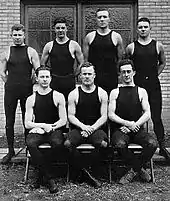 The 1914–1915 Pitt wrestling team included All-American football star and future legendary Pitt head football coach Jock Sutherland (top row, second from right)