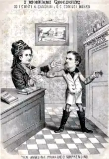 An illustration in Torres's pamphlet I Moderni Cagliostri showing Cesare Bonasi and his wife Angela Candini "Tieni Angelina prima che ci sorprendino"