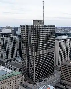 Place de Ville is a complex of office towers in downtown Ottawa, Ontario, Canada. It consists of four office buildings: Place de Ville A, B, and C; and the 'Podium' building, which houses a shuttered "piggy-back" cinema enveloped with functional office space. The complex also has two large hotels, the Delta Ottawa City Centre (410 rooms) and Ottawa Marriott Hotel (487 rooms). The buildings are linked by an underground shopping complex. Place de Ville C is the tallest office building in Ottawa. It was once advertised as "Ottawa's glittering answer to the Toronto Dominion Centre and Place Ville Marie".[1]