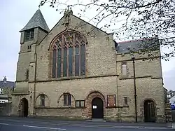 The chapel is situated on Red Lion Street, and opposite Burnley Library which lies directly on the other side of Croft Street.[59] The chapel was built in 1850-52 and was the work of local architect James Green of Portsmouth, near Todmorden. Green was also responsible for Burnley Mechanics in 1855. The chapel is in the Italianate style, on a high basement with steps to deeply arched entrances on each side. The ground floor is rusticated, a device often used by Green. The upper floor has, at the centre, a tripartite pedimented window.[60]