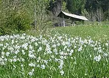 Today the village is known as a starting point for hiking routes to nearby scenic peaks such as Golica and Rožca, and especially for the wild white narcissus that flower in mountain pastures around the village from late April to early May. The plants have been protected by law since 1949 and picking them is strictly forbidden. A narcissus festival is held by the local tourist association in May. The chairlift for the Španov vrh ski slope also begins in Planina pod Golico.[11] There is also a natural luge track beyond the village in the Sava Caves area[12] and competitions are held by the Jesenice Luge Club here every winter.