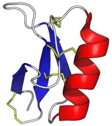 Plant defensins are members of the protein superfamily called the cis-defensins or CSαβ fold.[15] This superfamily includes arthropod defensins and fungal defensins (but not defensins found in mammals). It also includes several families of proteins not involved in the immune system, including plant S-locus 11 proteins involved in self-incompatibility during reproduction and toxin proteins in scorpion venoms.[16][17] Defensin proteins are produced as an amphipathic protein precursor with one or two pro-domains that are removed to make the final mature protein. In their mature form, they generally consist of about 45 to 50 amino acid residues. The folded globular structure is characterized by a well-defined 3-stranded anti-parallel beta-sheet and a short alpha-helix.[18] The structure of most plant defensins is cross-linked by four disulfide bridges: three in the core and one linking the N- and C-termini. Some plant defensins have only the core three disulfides, and a few have been found with an additional one (resulting in five total bridges).[19] Two of these bonds, those formed between the α-helix and the last β-strand, are arranged into the Cys-stabilized α-helix β-strand (CSαβ) motif, which play significant roles in their biological activities and stability.[20][21] The globular structures of plant defensins make them resistant to degradation by proteolytic digestion and stable up to a pH and a temperature range of 10 and 90 degrees Celsius, respectively.[22][23]
