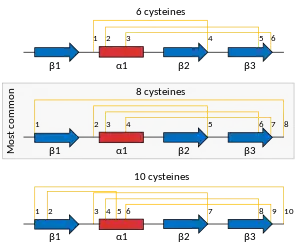 Secondary structure of main types of plant defensins (with cysteines numbered). The 8-cysteine variant is the most common. Alpha helix in red, beta strands in blue, disulphide bonds in yellow.