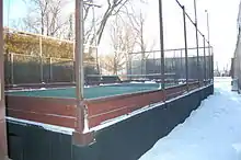 The court is one-quarter the size of a traditional tennis court and is surrounded by a chicken wire fence 12 feet (3.7 m) high. The taut fencing allows balls to be played off the wall and remain in play. Originally developed on land unsuitable for traditional tennis courts, such as along hills, the space under the platform allows for the installation of heating equipment that, together with lighting, can allow for year-long play around the clock, even in cold weather. Courts in warm-weather locations are more likely to be constructed on level ground, as the need for clearing snow and ice is obviated.[7] The deck is 60 feet (18 m) long by 30 feet (9.1 m) in width. The court measures 44 feet (13 m) in length by 20 feet (6.1 m) in width and is divided by a net that is kept taut at a height of 34 inches (860 mm) at its center and 37 inches (940 mm) at either end.[8]