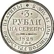 Minting began with 3-ruble coins, and 6-ruble and 12-ruble coins were added in 1829 and 1830, respectively.[2] 1,371,691 3-ruble coins were minted, along with 14,847 6-ruble and 3,474 12-ruble coins.[1] The first coin was sent to the prominent German scientist Alexander von Humboldt, who was previously asked to evaluate the use of platinum as a currency and confirm its price relative to silver. After his death, the emperor Alexander II bought that coin, and in 1859 it was returned to Russia and later became an exhibit of the Hermitage Museum in Saint Petersburg.[3]