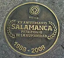 Plaque in the center of the plaza, which says Twentieth anniversary [of] Salamanca patrimony of humanity 1988-2008.